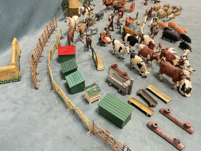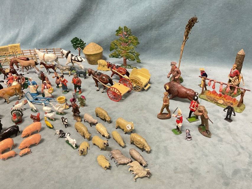 A collection of Britains and other lead and alloy farm figures including farmers and farm staff, cattle, sheep, poultry, pigs, donkeys, horses and carts, trees, fences, stone walls, feeding troughs, a haystack, animal hutches, a beehive, and some military and Wild West figures. (A lot)