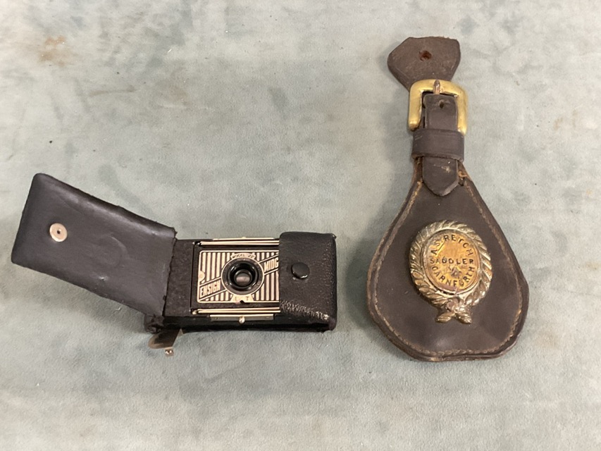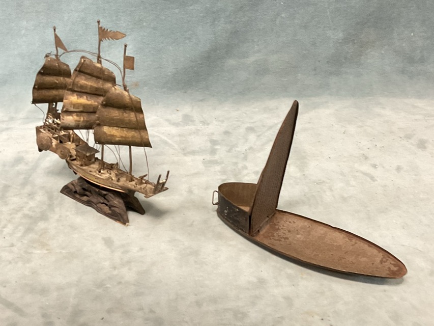 A silver plated model of a heavily armed Chinese war junk on a hardwood stand; a 30s Ensign Midget Model 22 miniature folding bellows camera; a Victorian leather and brass saddlers harness badge; and a C19th japanned tinplate navette shaped nutmeg grater. (4)