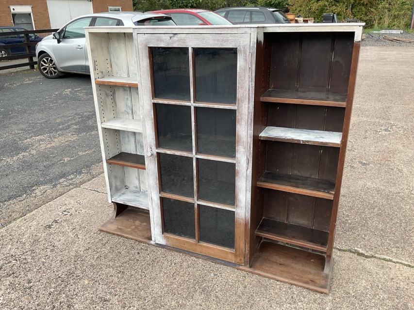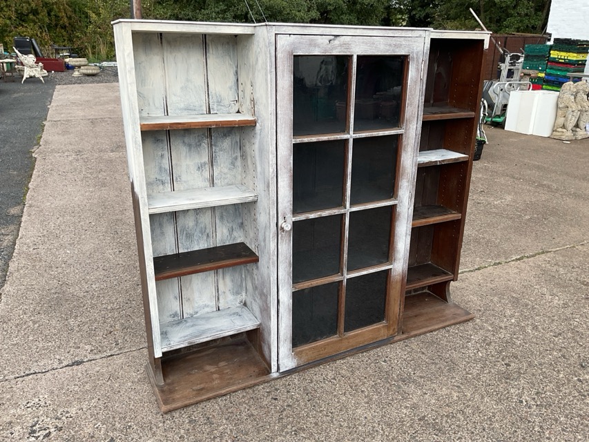 A painted nineteenth century breakfront mahogany bookcase cabinet, the central section with glazed door enclosing adjustable shelves, the open sides each with further adjustable shelves, raised on moulded plinth. (59.75in x 12in x 52.5in)