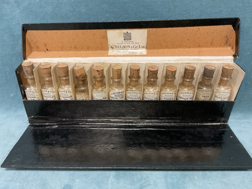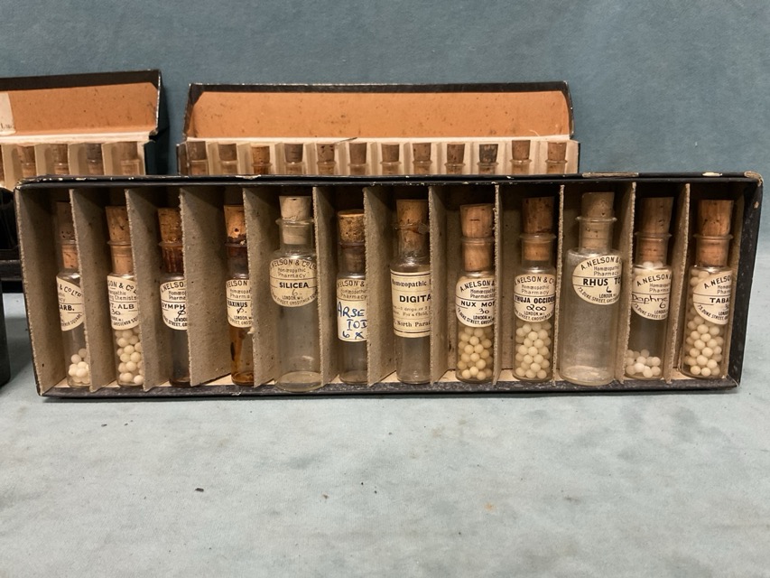 Four early C20th boxed sets of twelve corked glass vials containing homeopathic pills and remedies by A Nelson & Co - London, Chemists to HM the King. (4)