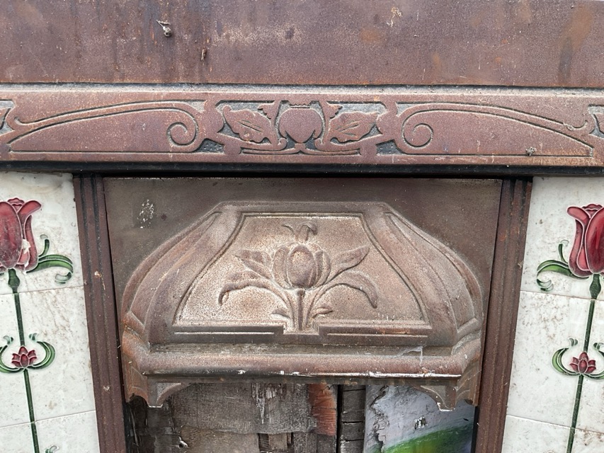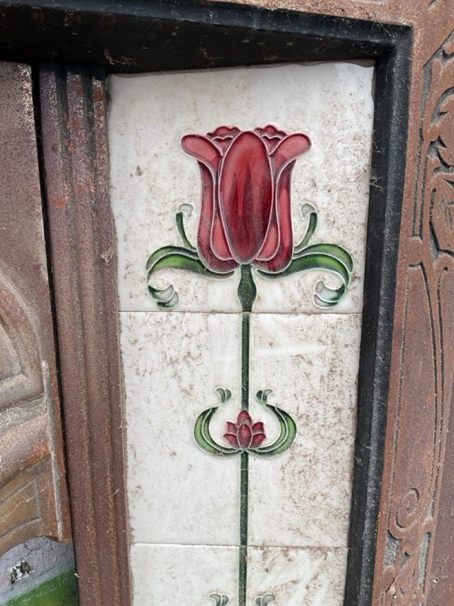 A late Victorian art nouveau cast iron fire insert with floral tube lined tiles framing burning aperture, having hood with embossed floral sprig panel. (37.75in x 37.75in)