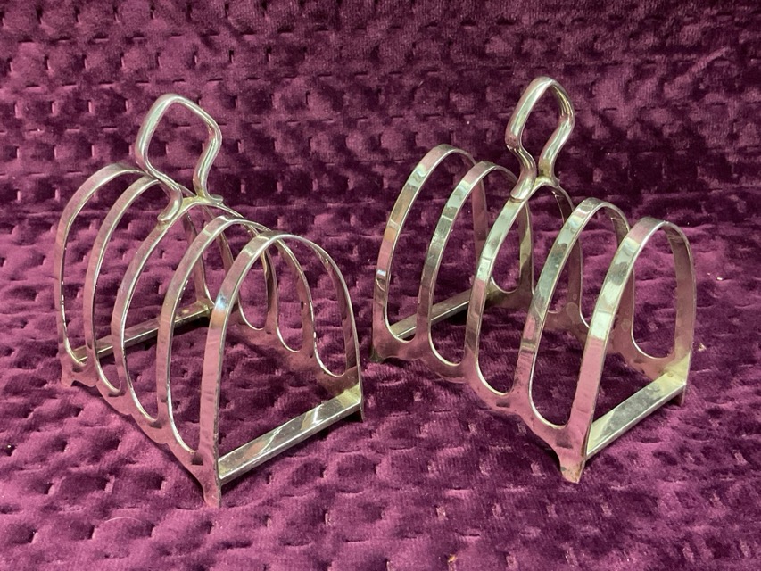 A pair of hallmarked silver toast racks, the arches dividers with bud-shaped handles - Sheffield 1944, H Hunt. (136.8g) (2)