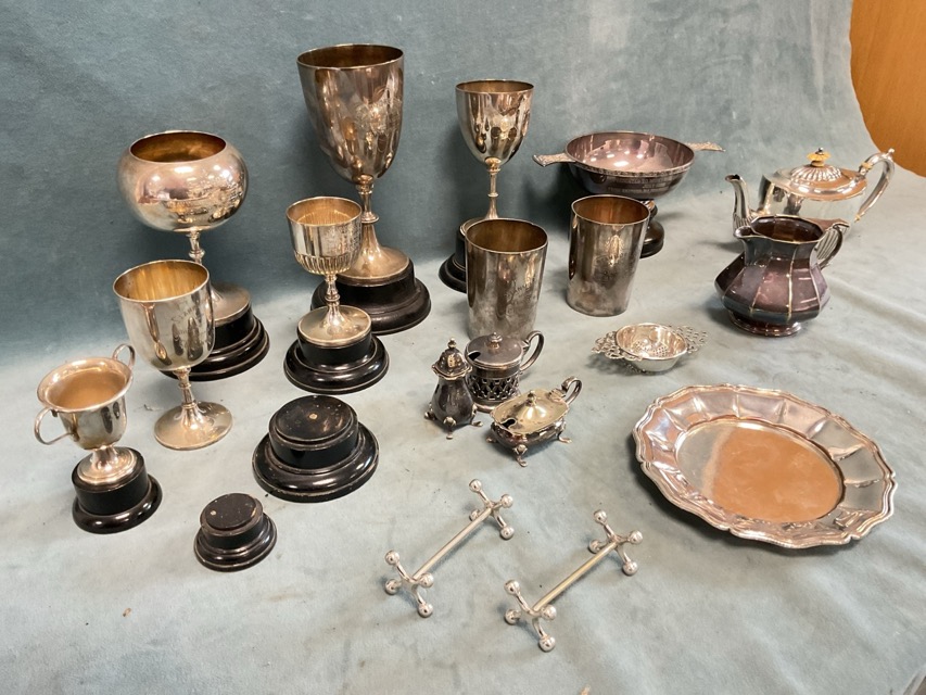 Miscellaneous silver plate - a ribbed bachelors teapot, a celtic quaiche, a chamfered jug, cruets, a pair of knife rests, a tea strainer, etc; and a collection of EPNS trophy cups on stands & two beakers. (A lot)