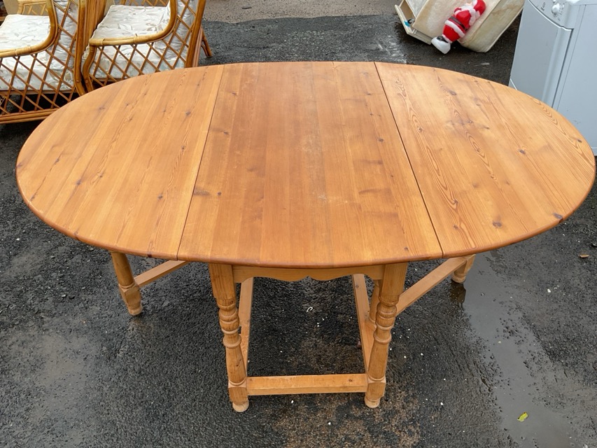 A large oval pine kitchen table with two drop leaves having shaped aprons to ends, raised in baluster turned legs on bun feet, joined by rectangular stretchers. (66in x 45.25in x 29.75in)