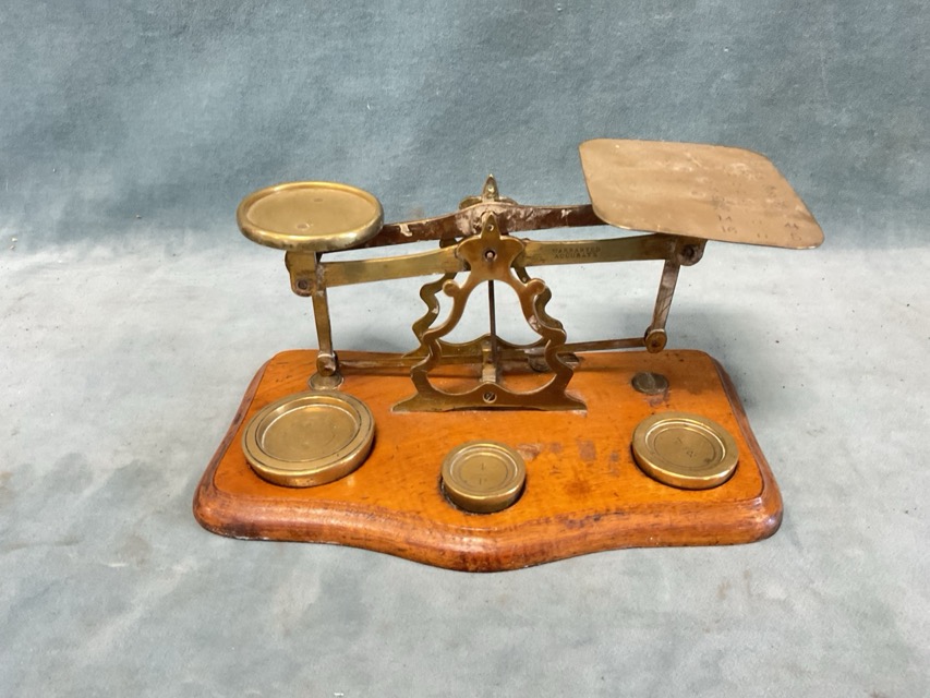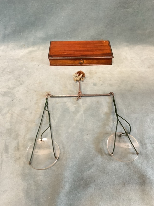 A Victorian set of mahogany cased pharmacists scales with steel balance and glass pans on cords with brass weights; and a Victorian brass letter scale with pierced supports and brass weights on a serpentine fronted maple base. (2)