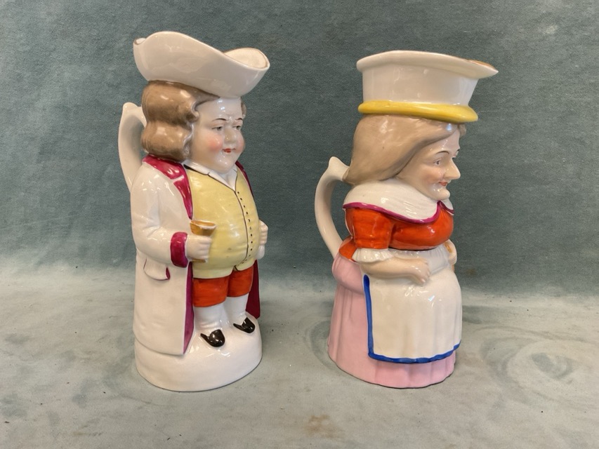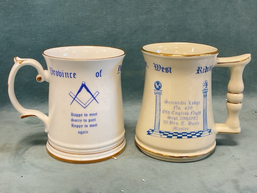 A pair of C19th Carl Thieme Potschappel porcelain Toby jugs in the form of a C18th gentleman a female cook; and two ceramic commemorative Masonic beer mugs. (4)