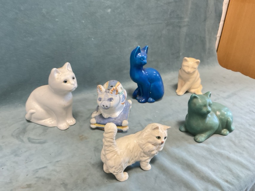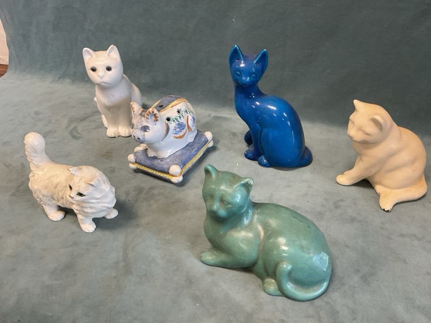 A collection of ceramic cats - Beswick white Persian, Portuguese handpainted faience flower holder cat, Italian turquoise glaze, and three matt glazed examples. (6)