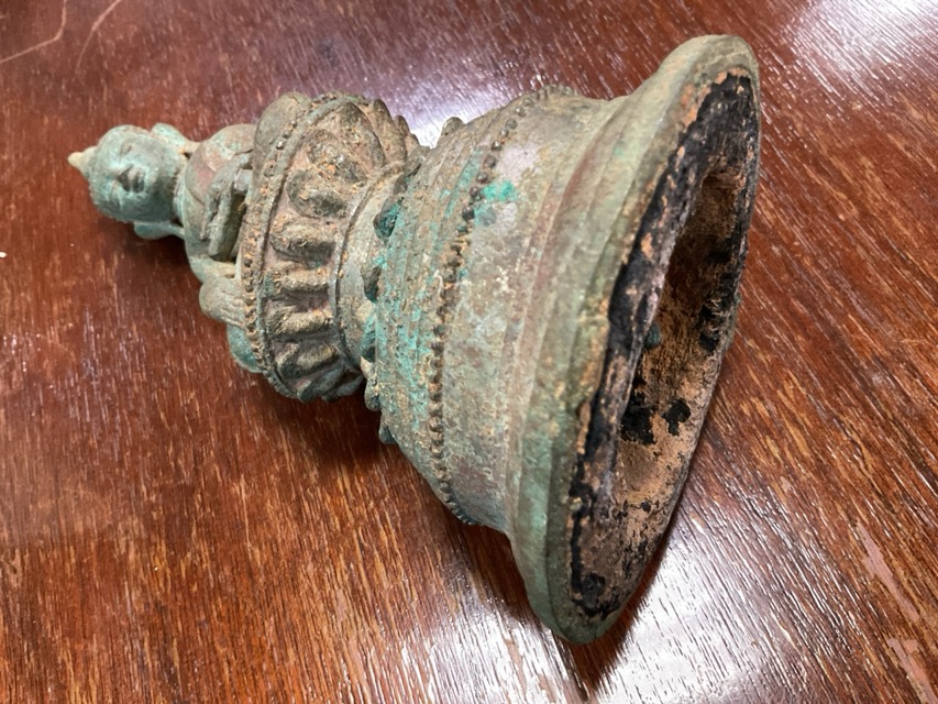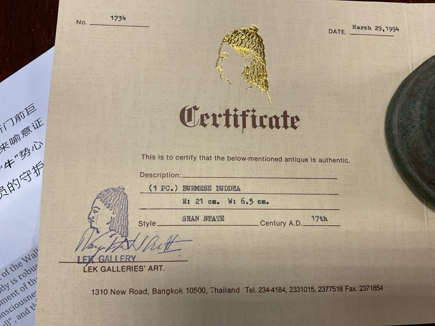 An antique bronze Burmese buddha, the seated figure on waisted circular lozenge cast plinth - with Thailand Lex Galleries certificate. (8.5in)