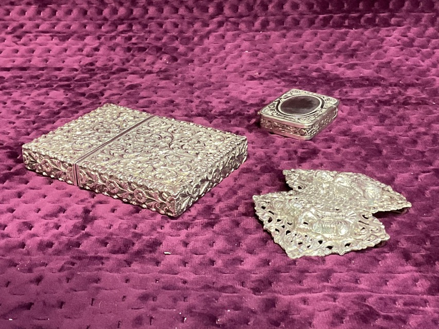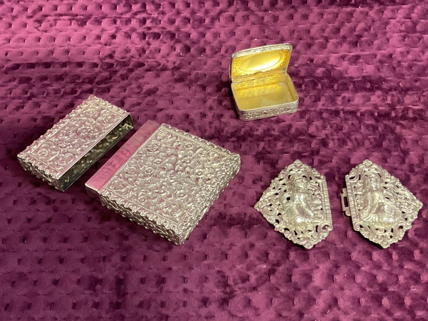 A C19th Indian silver card case with allover embossed scrolling flower and foliage decoration; a Burmese silver two-part nurses buckle with pierced foliate and relief cast figure decoration; and a German Robert Kraft Alpacca rectangular silver pillbox with gilt interior and floral embossing. (111.8g) (3)