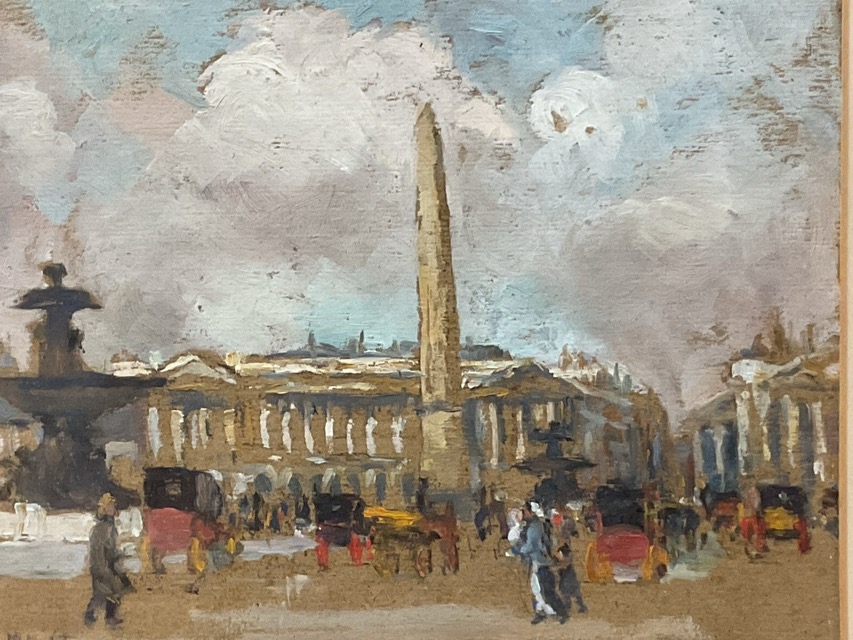 Gwendoline Margaret Hopton, oil on card, impressionistic early C20th view of the Place de la Concorde, Paris with the obelisk, taxis and figures, signed, mounted and framed. (9in x 7in)