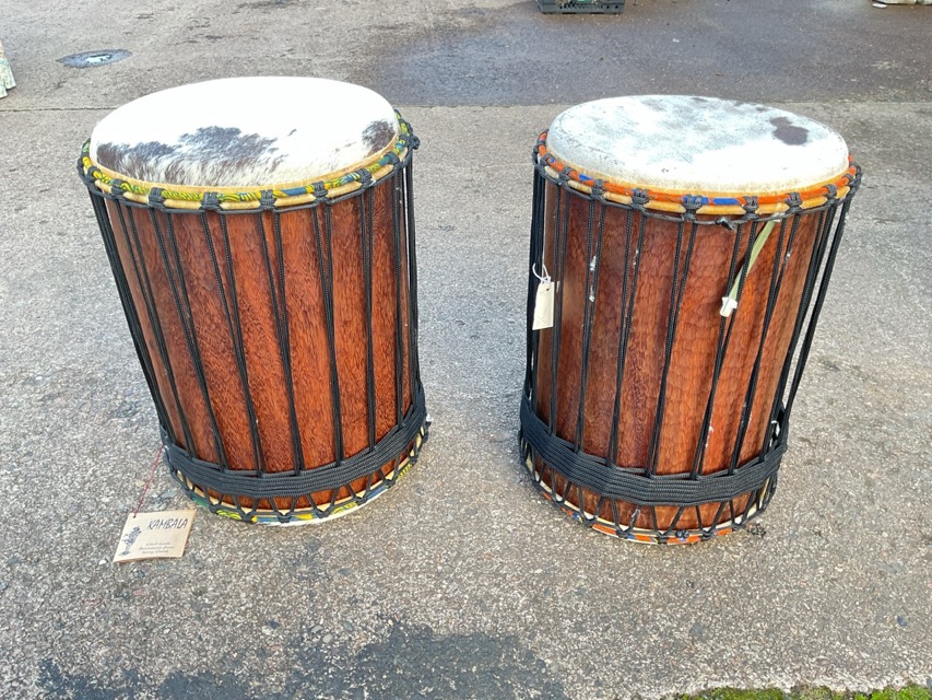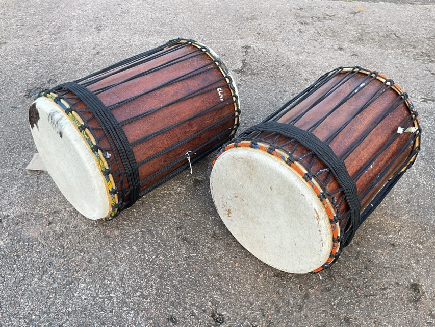 A pair of professional Ivory Coast Kambala DoumDoum double-sided drums with hollowed log bodies, cow hide skins and soft nylon fleece lined travel cases. (16in x 24in) (2)