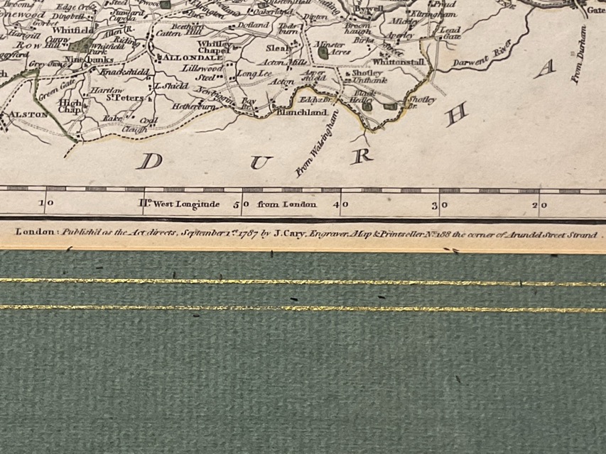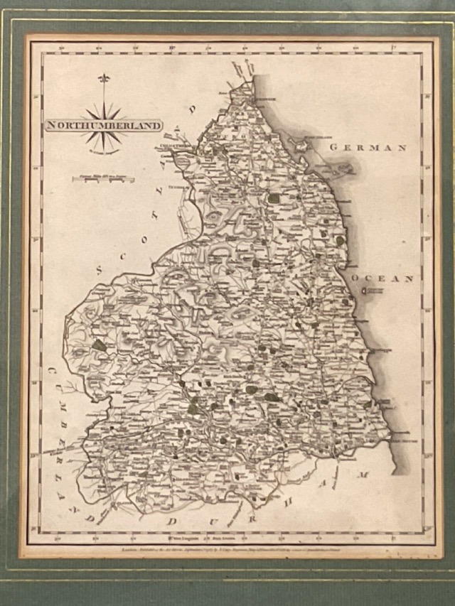 A 1787 John Cary handcoloured engraved map of Northumberland, mounted and framed. (8.5in x 10.5in)