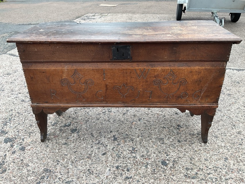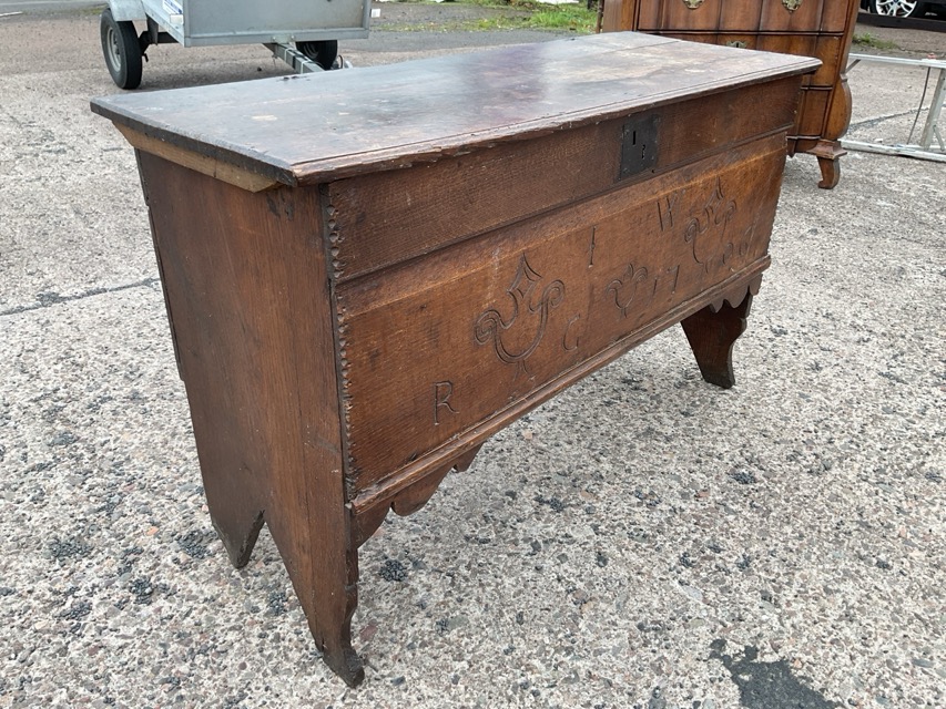 An eighteenth century Dutch oak coffer having front chisel carved panel with naive decoration dated 1706, supported on high trestle style supports. (42in x 15.5in x 25.25in)
