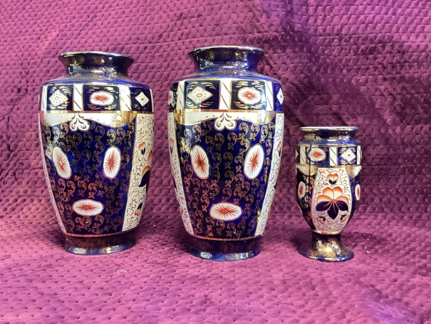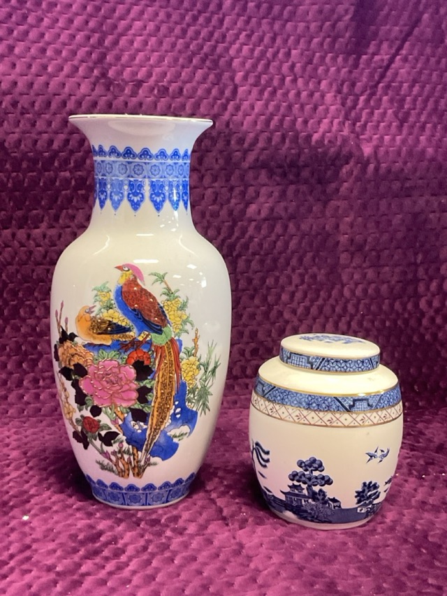 A pair of Edwardian ceramic vases with Derby Imari style decoration, another similar smaller footed vase, a Chinese porcelain vase decorated with finches and pheasants amid flowering branches, and a Royal Doulton Real Old Willow pattern covered ginger jar. (5)