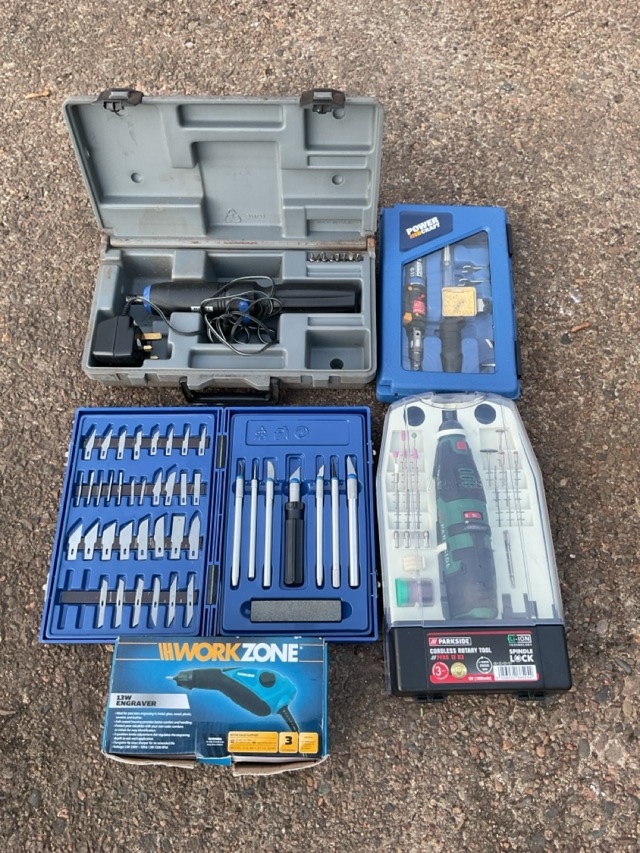 Miscellaneous cased small electric power tools - engravers, solderer, Ryobi rotary tool, Bosch power screwdriver, rotary grinder, socket set, Kraft knife set, electric secateurs, etc. (9)