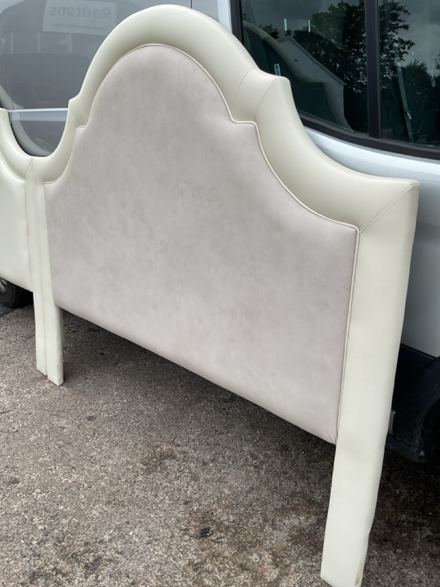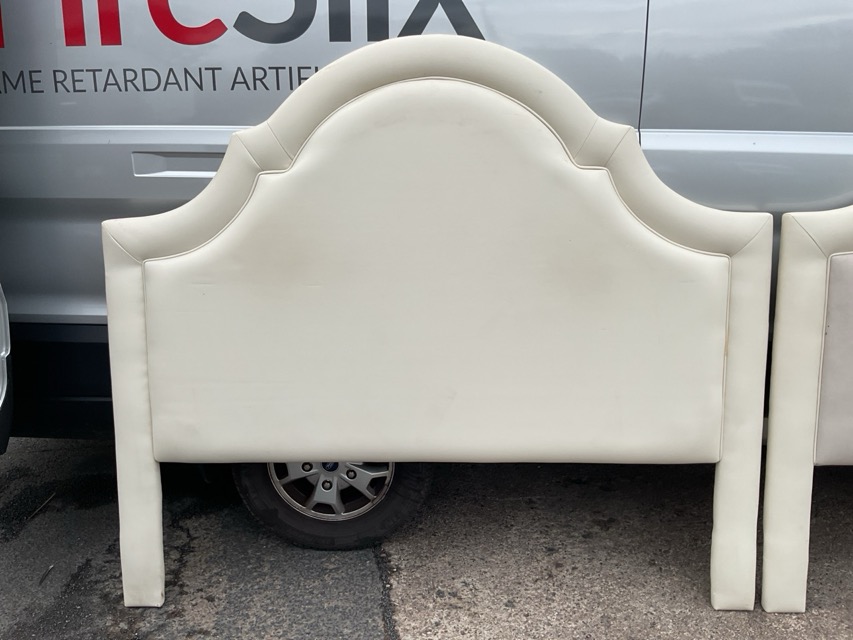 A pair of contemporary ivory coloured leather upholstered super-king size headboards with arched panels in cushion framed borders - ex Hotel, Etc.. (76.5in x 67in) (2)