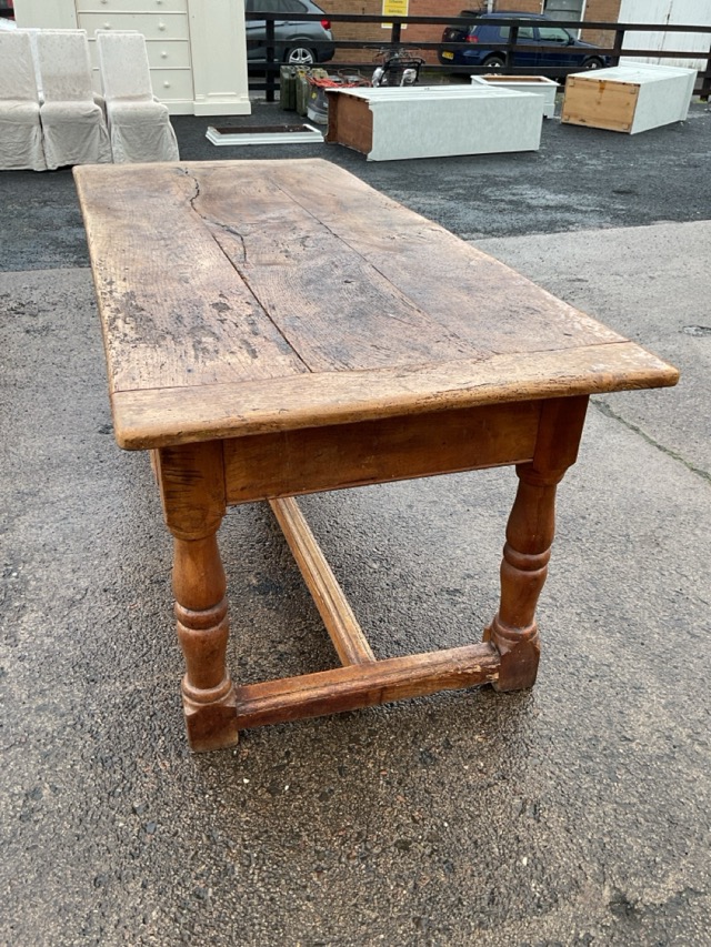A nineteenth century oak table with cleated plank top above carved friezes, raised on turned legs joined by moulded stretchers. (77.5in x 33.5in x 30.75in)