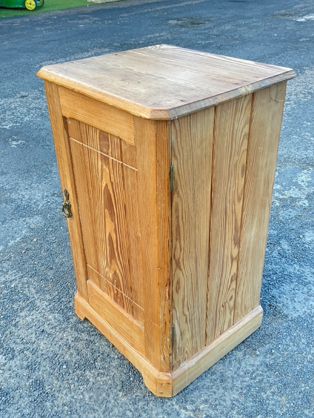 A Victorian pitch pine pot cupboard with canted chamfered top above a panelled door, raised on moulded plinth. (17.5in x 15.5in x 29.5in)