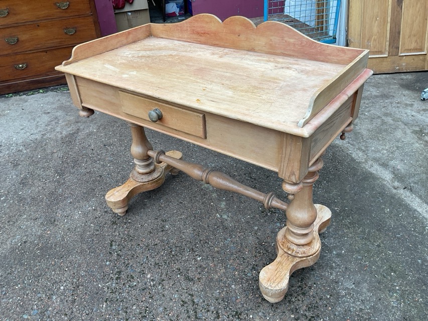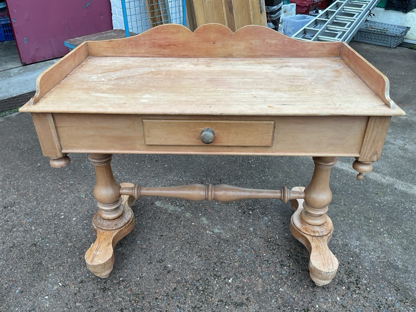 A Victorian pine washstand with shaped upstand above rectangular top having knobbed frieze drawer, raised on bulbous turned columns on platforms with turned feet. (41.75in x 20.5in x 35in)