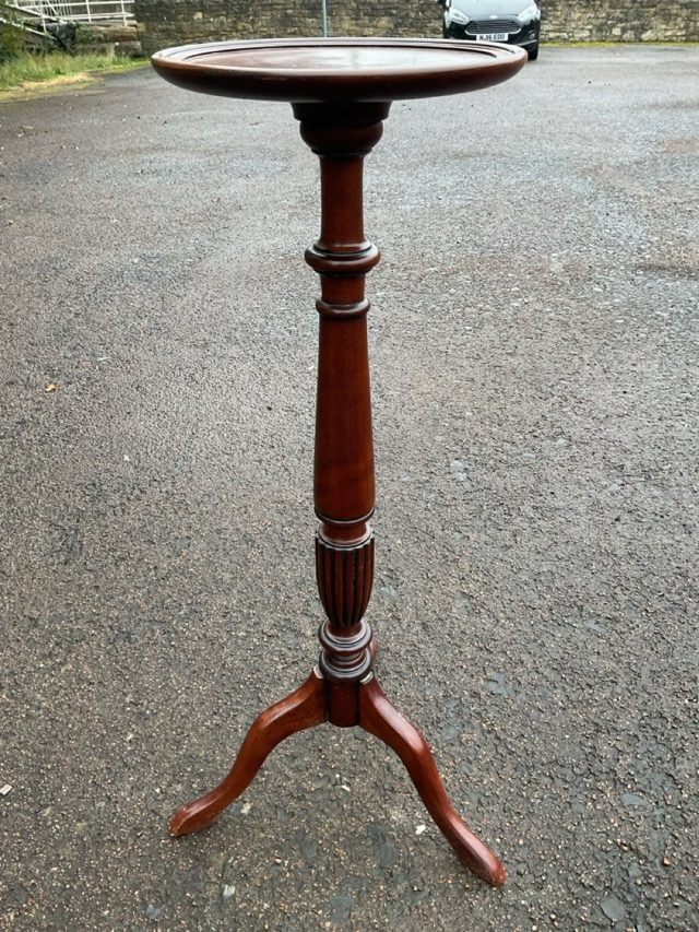 A mahogany jardiniere stand with circular tray top on turned column with fluting, above tripod legs. (36in)