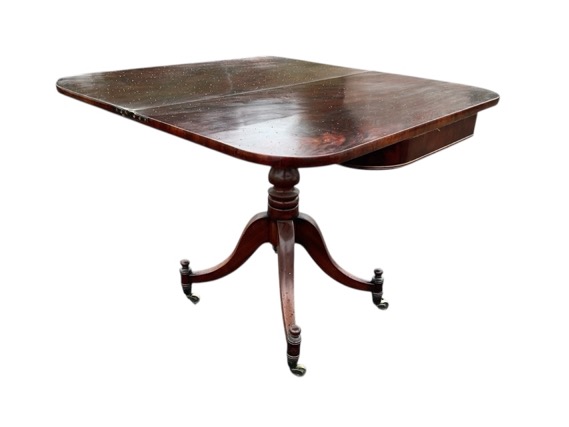 A C19th turn-over-top mahogany tea table, with rounded twin leaves on turned column supported on hipped quadripartite legs with brass castors. (35.75in x 17.5in x 29in)