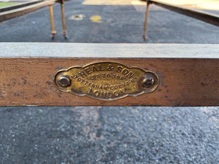 A pair of Edwardian Heal & Son brass beds of tubular construction having rounded ends, the cornerposts on castors joined by angleiron side rails. (36.75in x 79.25in x 46.5in) (2)