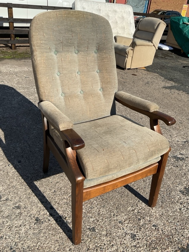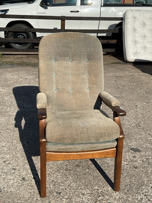 A button upholstered elm armchair with rounded back and padded armrests framing a sprung seat with loose cushion, raised on rounded tapering legs.
