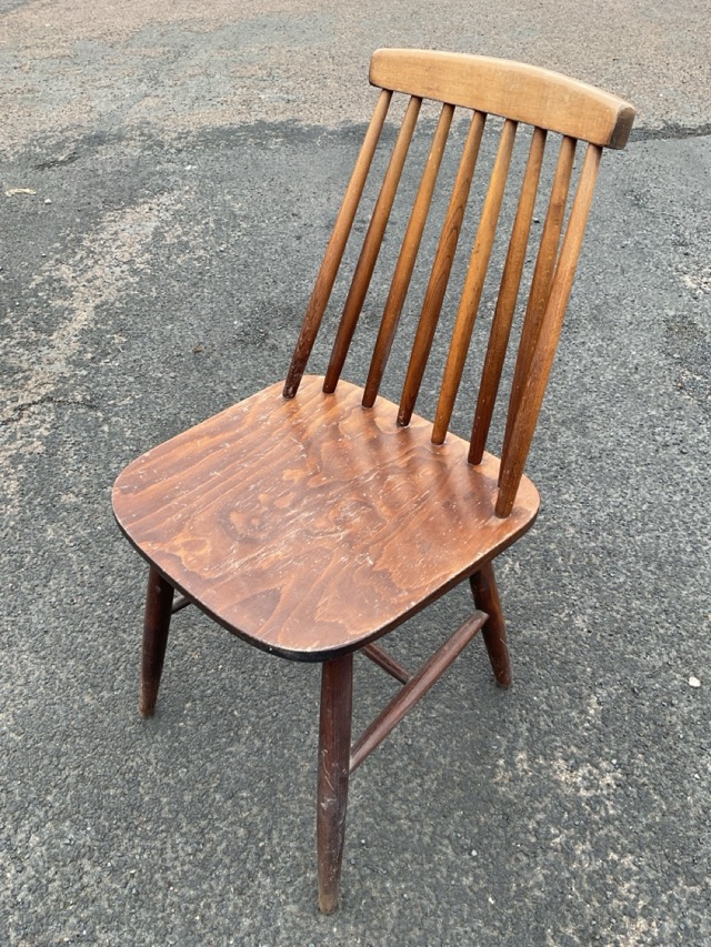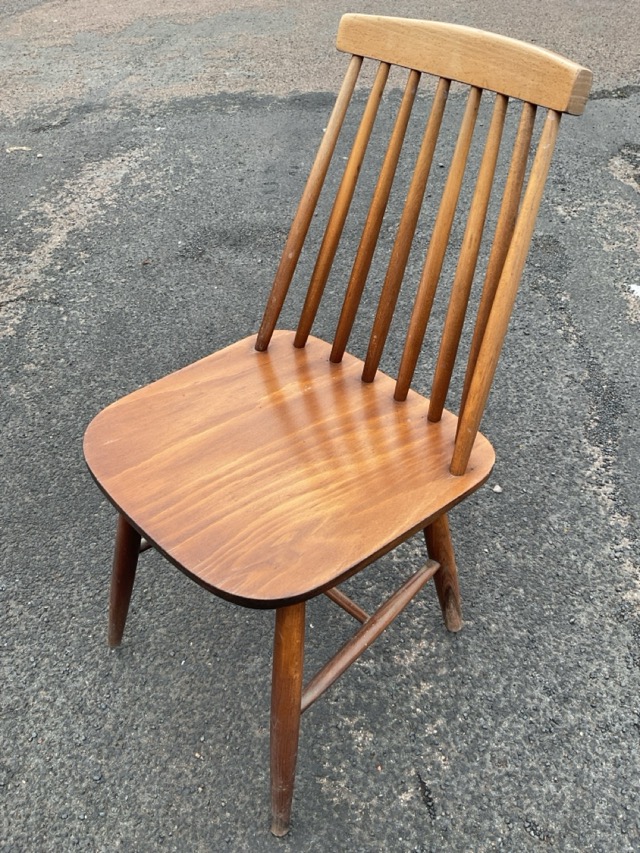 A pair of 60s spindleback chairs with rounded seats raised on turned legs & stretchers. (2)