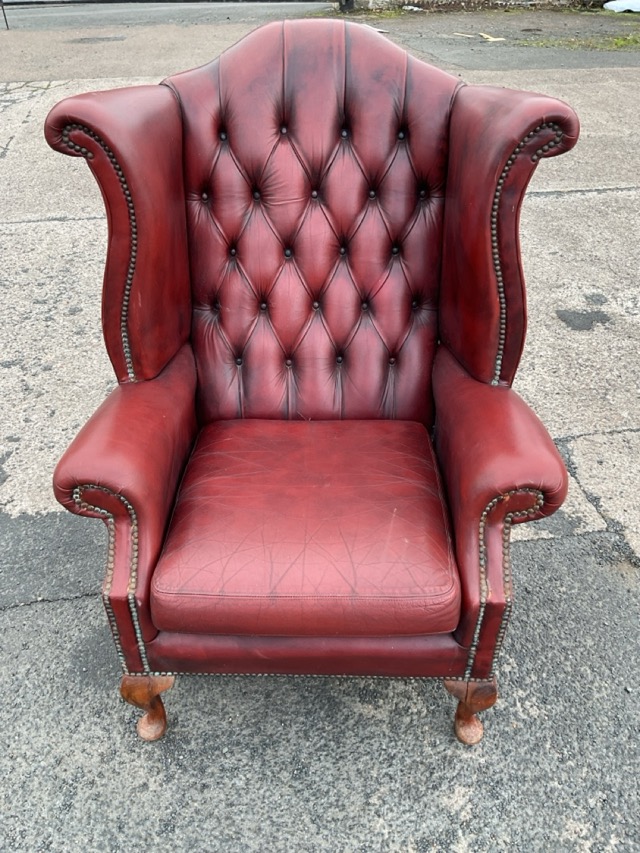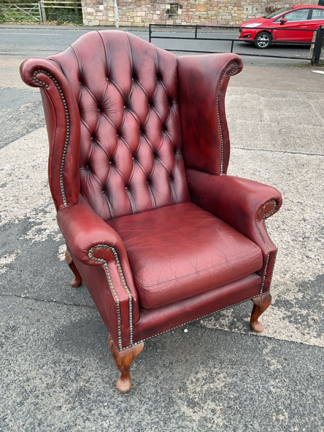 A Georgian style leather button upholstered wing armchair with arched back and scrolled studded wings above padded arms, the sprung seat with loose cushion raised on cabriole legs.