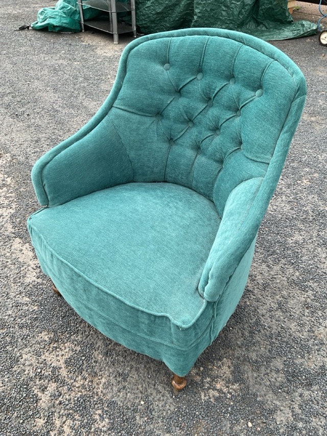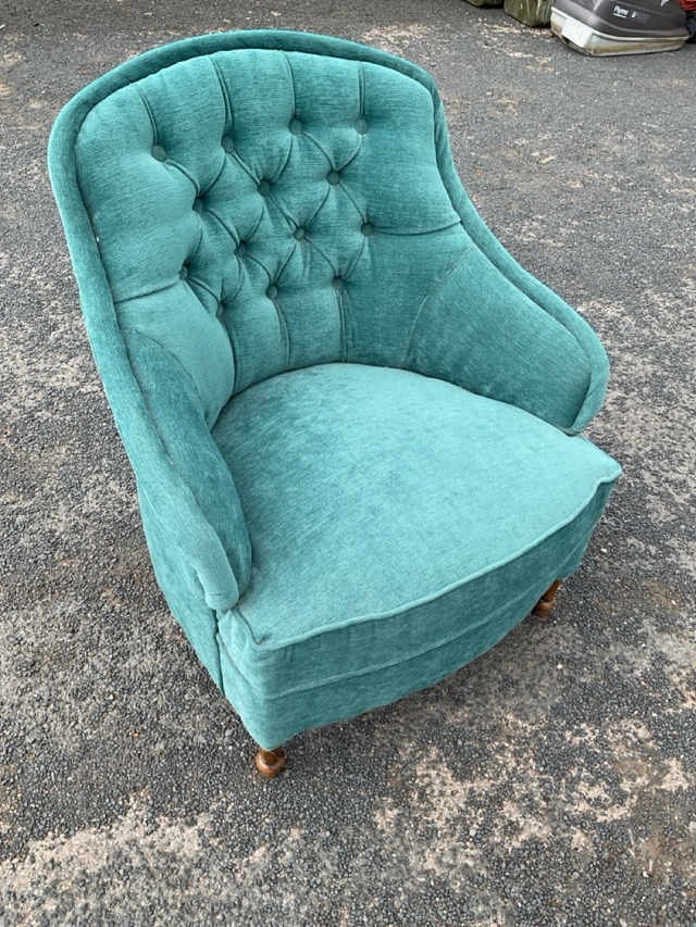 A button upholstered tub armchair with rounded back and downswept arms framing the bowfronted sprung seat, raised on turned legs.