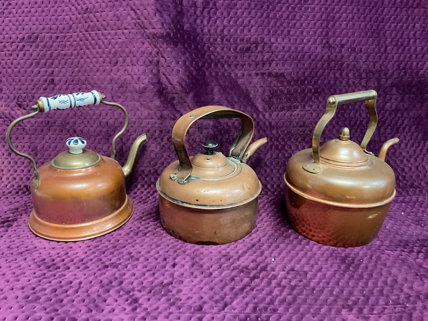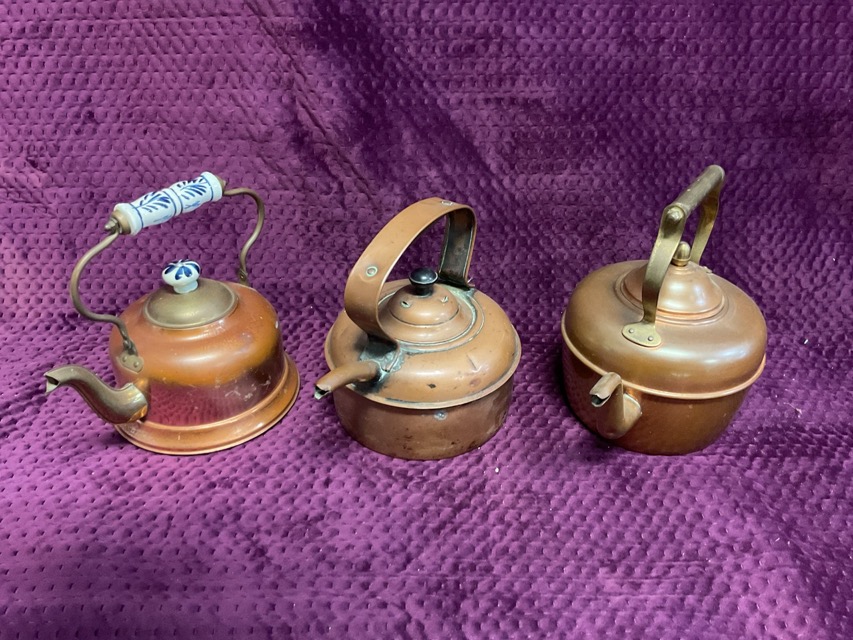 Three copper kettles - Dutch with delft handle and knob, Edwardian with strap handle, and Victorian style with brass bar handle and acorn knob. (3)