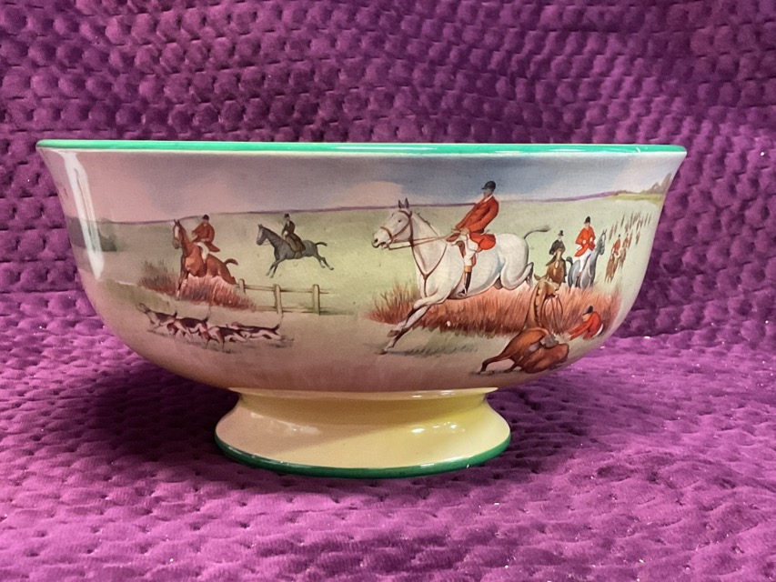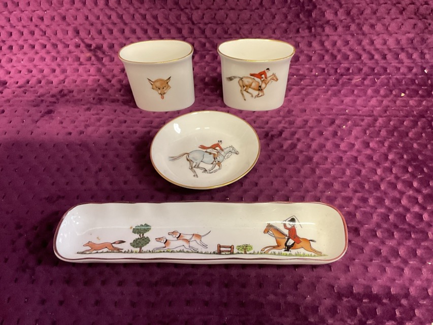 Fox hunting ceramics - a pair of Royal Worcester porcelain cigarette holders and matching boxed pin dish decorated with huntsmen and fox heads, a Crown Staffordshire pen tray; and a Royal Doulton Fox-Hunting pattern footed fruit bowl. (5)