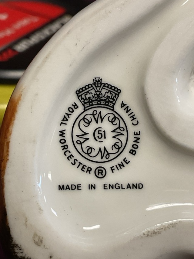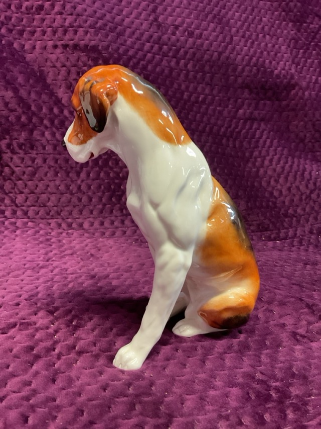 A Royal Worcester handpainted porcelain figure of a seated foxhound. (6.5in)