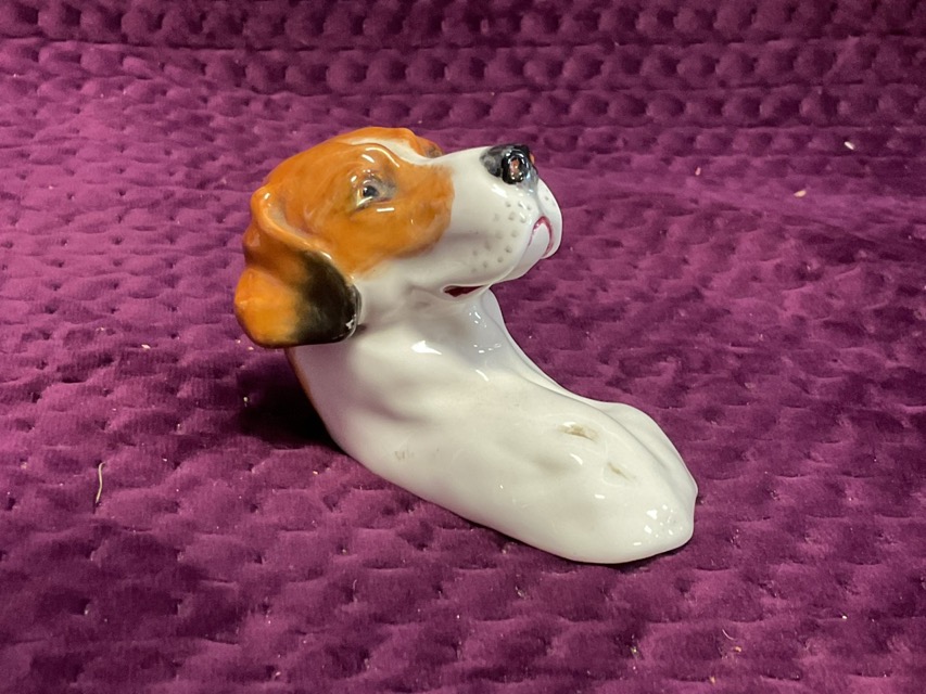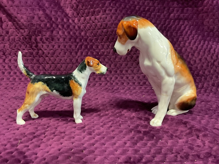 A 1935 Royal Worcester handpainted porcelain figure of a seated foxhound - 6.5in; a Royal Worcester foxhound head wall mask - 4in; and a Royal Doulton ceramic figure of a standing foxhound model HN1027 - 4in. (3)