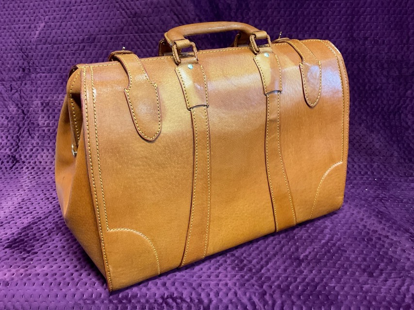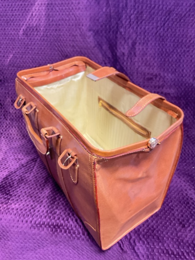 A Bruno Conti leather designer doctors bag style overnight bag with hinged opening, buckled leather straps and brass lock with keys, with original dust cover. (20in x 9in x 15in)