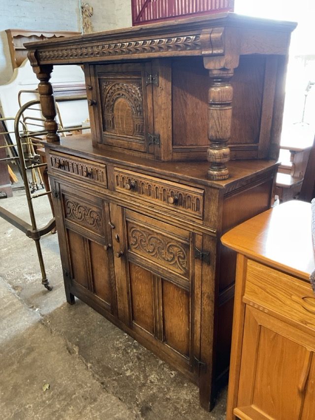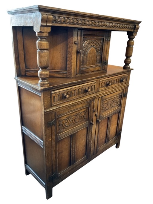 A carved oak court cupboard with moulded top and chip-carved apron supported on turned columns framing a cupboard with arched door, the base with two frieze drawers above panelled door cupboards. (45.25in x 15.5in x 56.75in)