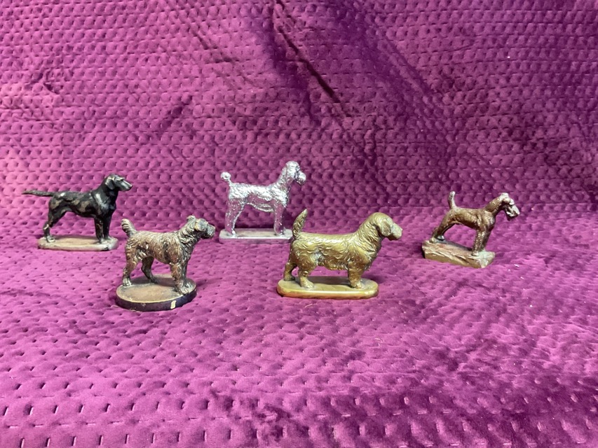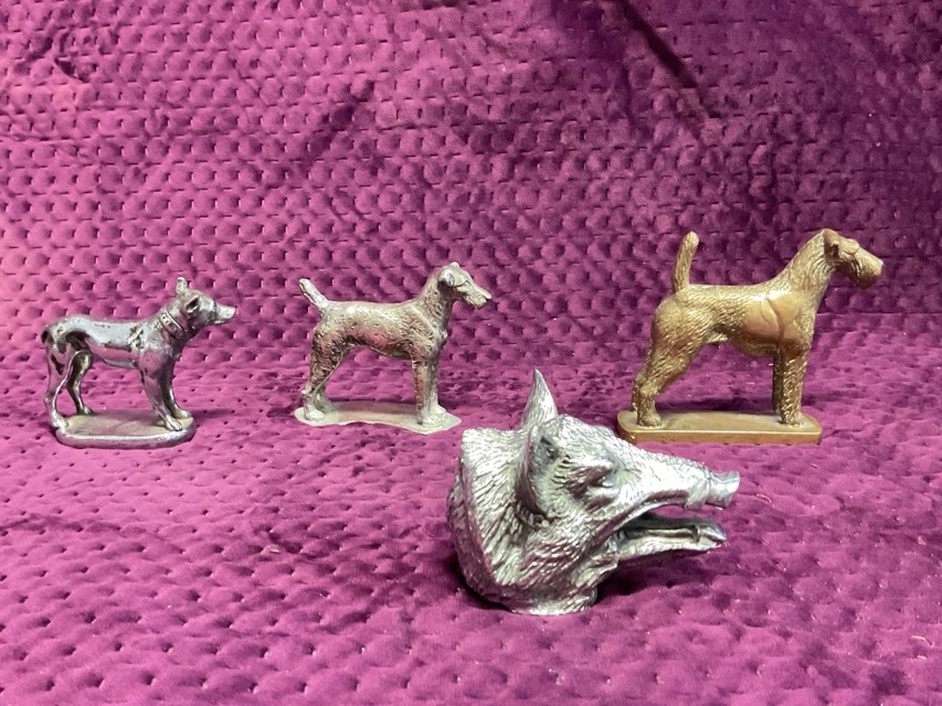 A collection of brass and chromed car mascots - eight dogs including black labrador, poodle, fox terrier, Jack Russell, Airedale, Glen of Imaal terrier, Manchester terrier, a Lakeland terrier radiator cap; and a boars head mascot. (9)
