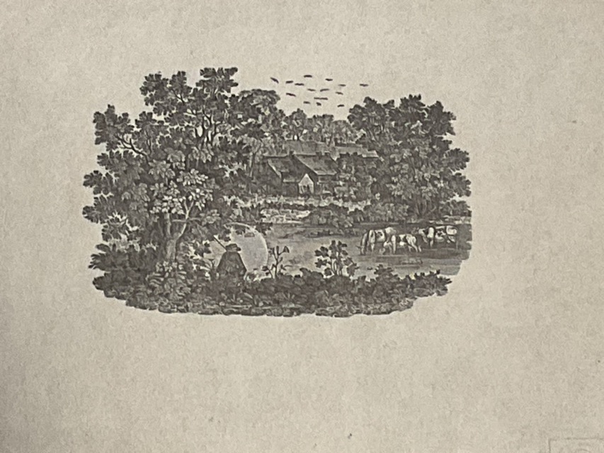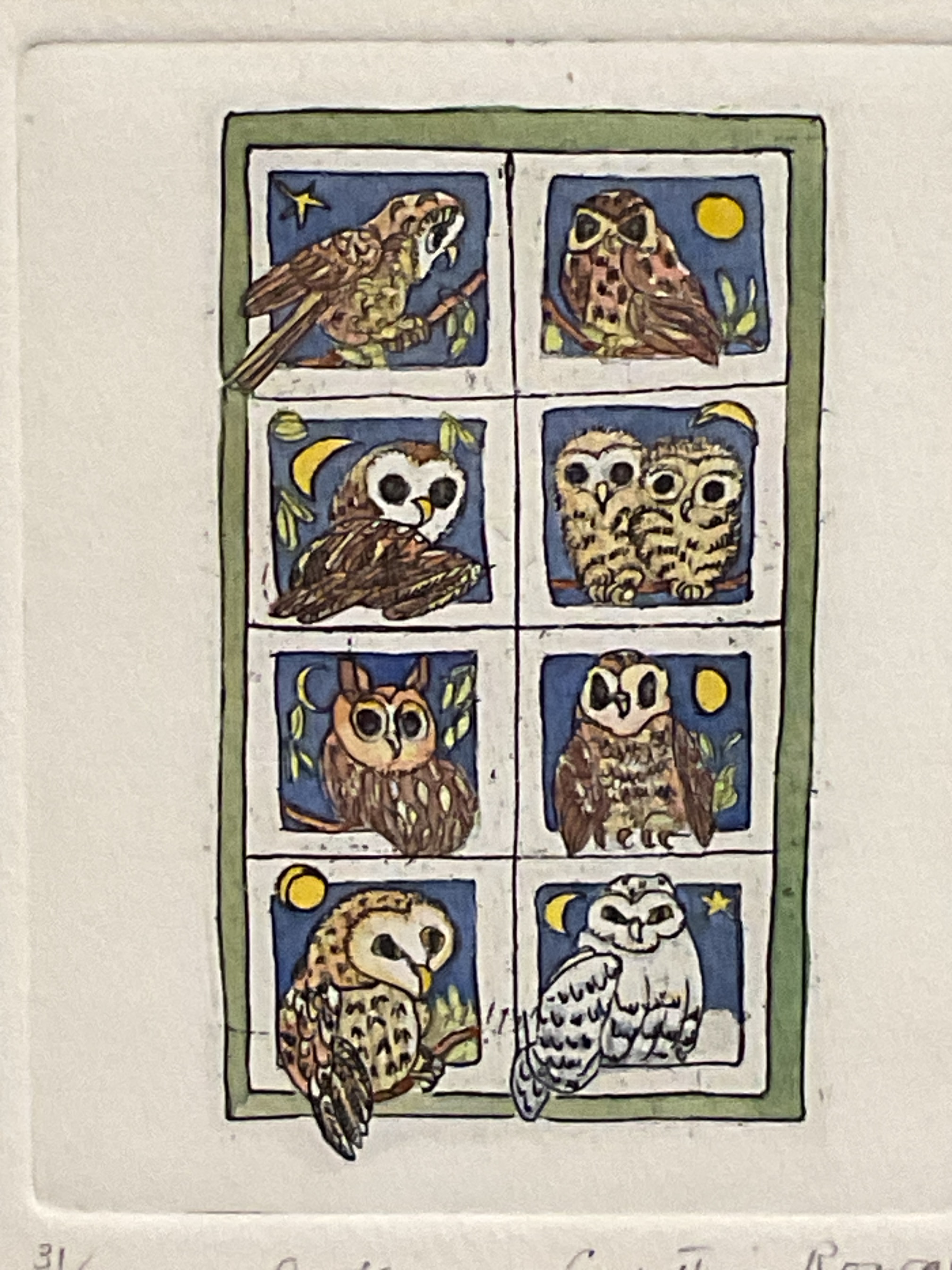 After Thomas Bewick, engraving reprinted from the original woodblock, an angler by a pond with cattle and farmstead, numbered, - 3.25in x 2.25in; and Cynthia Rowan, handcoloured etching, owls, signed and numbered - 2.5in x 4.25in, each mounted and framed. (2)