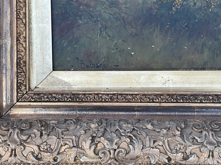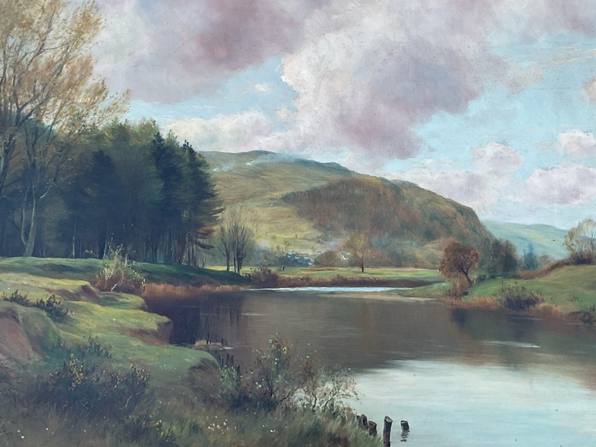 F Buchanan, Edwardian oil on canvas, river landscape, signed and inscribed to verso An April Day in the Vale of Conway North Wales 1903, in foliate scrolled gilt & gesso frame. (35.5in x 23.5in)