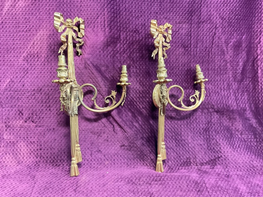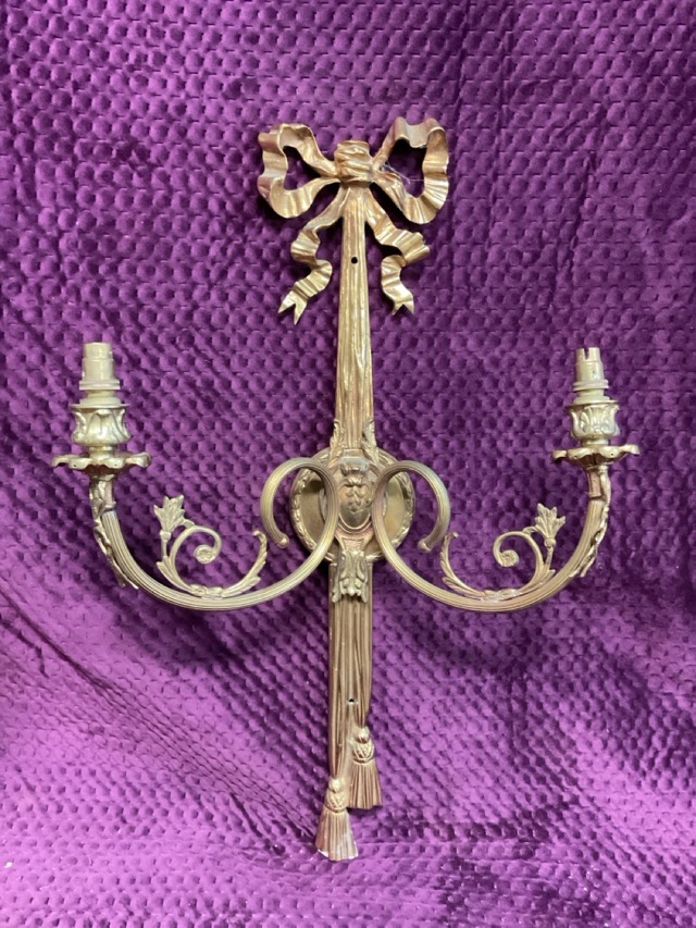 A pair of Louis XVI style gilt brass two-light wall lights, the backplates with bows above tasselled drops supporting circular foliate bosses and twin scrolled arms with acanthus mounts and flowerhead sconces with electric bayonet fittings. (23in) (2)