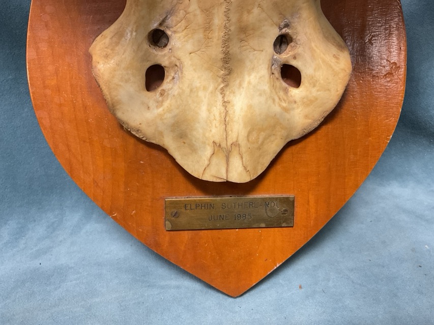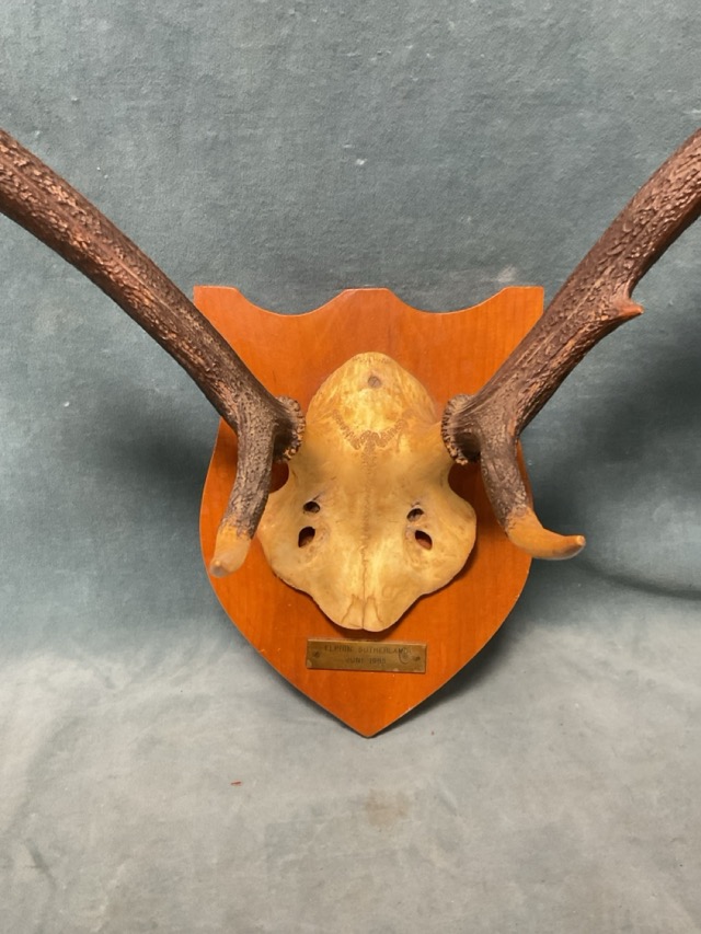 A pair of three-pointed antlers with skull crown, mounted on shield with brass plaque engraved Elphin, Sutherland June 1985. (20.25inx 27in)