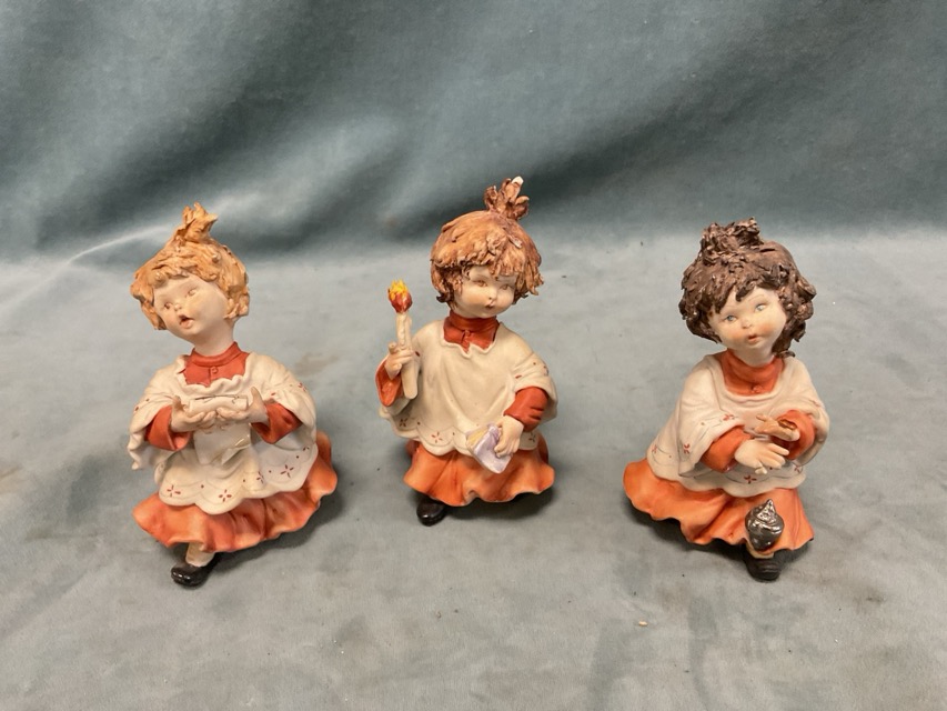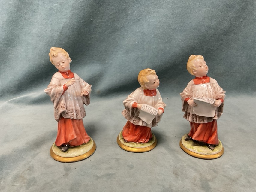 A set of three Merlin porcelain characterful choirboys on circular gilt bases; and a Capo di Monte set of three similar choirgirls. (6)