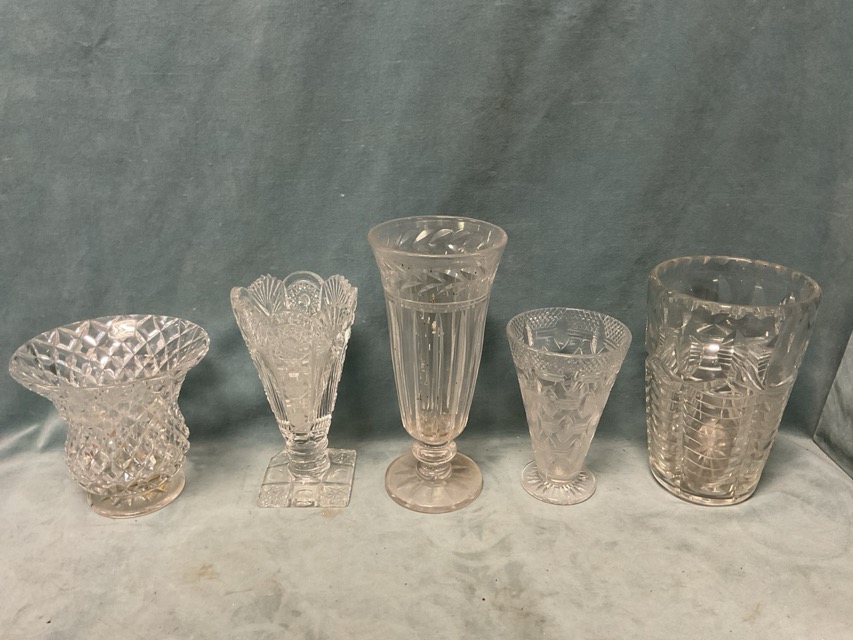 Fifteen miscellaneous glass vases - deco, tall cut, brandy balloon shape, coloured, Dartington, mottled, etc. (15)