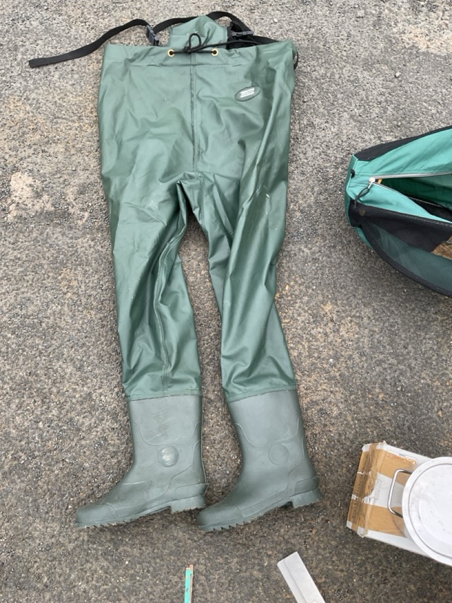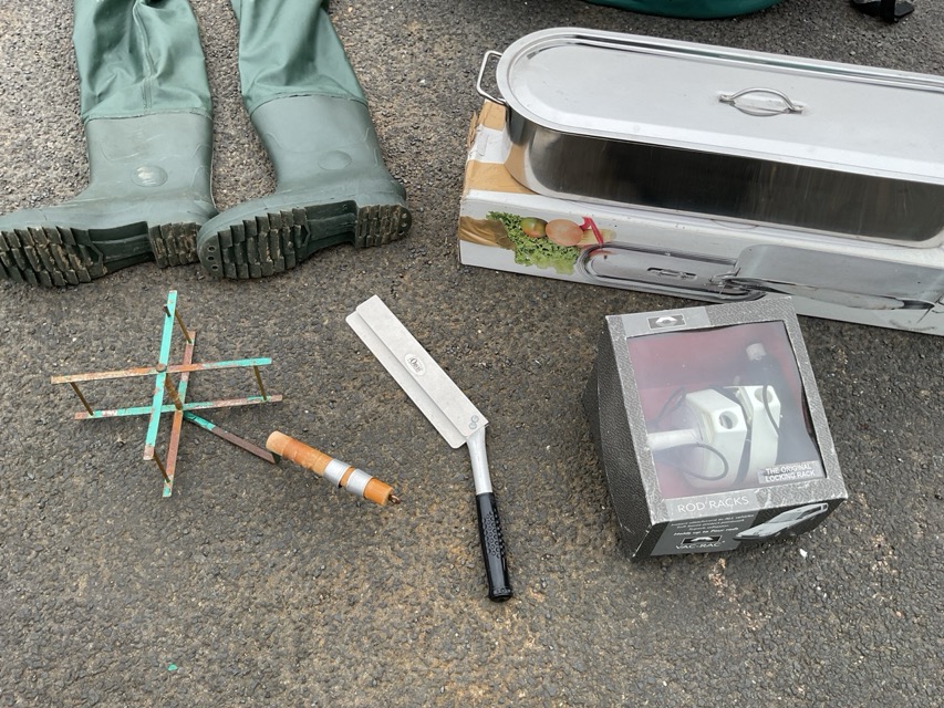 A pair of Shakespeare waders - size 10; a boxed car rod rack; a wooden handled iron line winder; an Orvis hand held clay pigeon launcher; a boxed fish poacher; and a Gamesafe collapsible mesh game bag. (6)