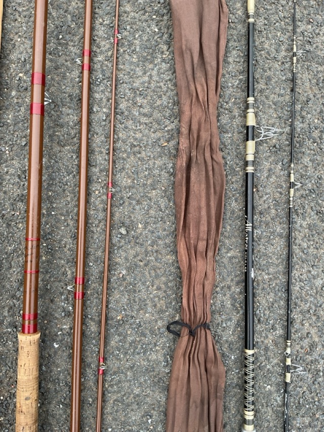 An 8ft three-piece Ebisu split-cane fly rod with additional piece; a 14ft three-piece fibreglass Rob Wilson fishing rod; and a 7ft fibreglass Albatross Holglas spinning rod. (3)