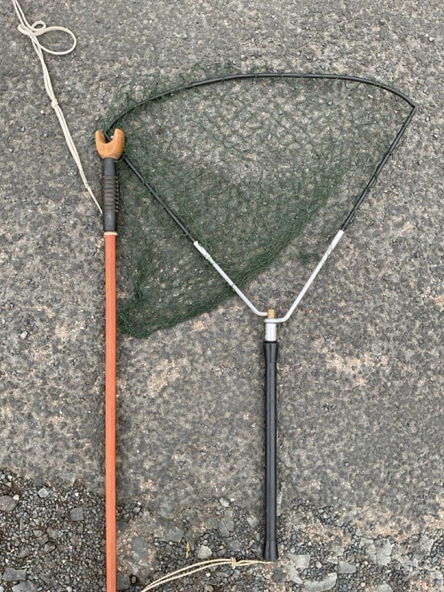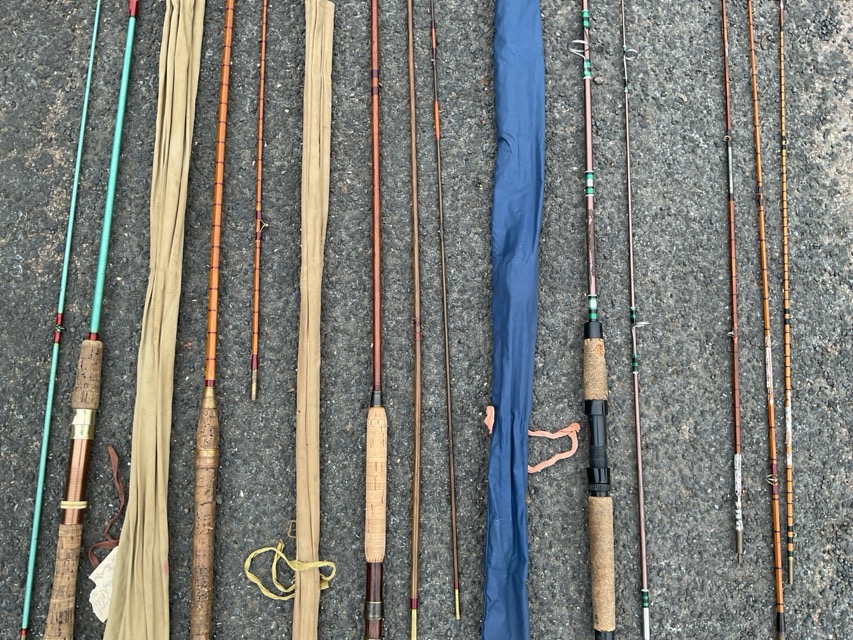 Four miscellaneous unmarked fishing rods - cane, split-cane & fibreglass, three with sleeves; three split-cane rod tips; a triangular landing net; and a long split-cane wading stick. (9)