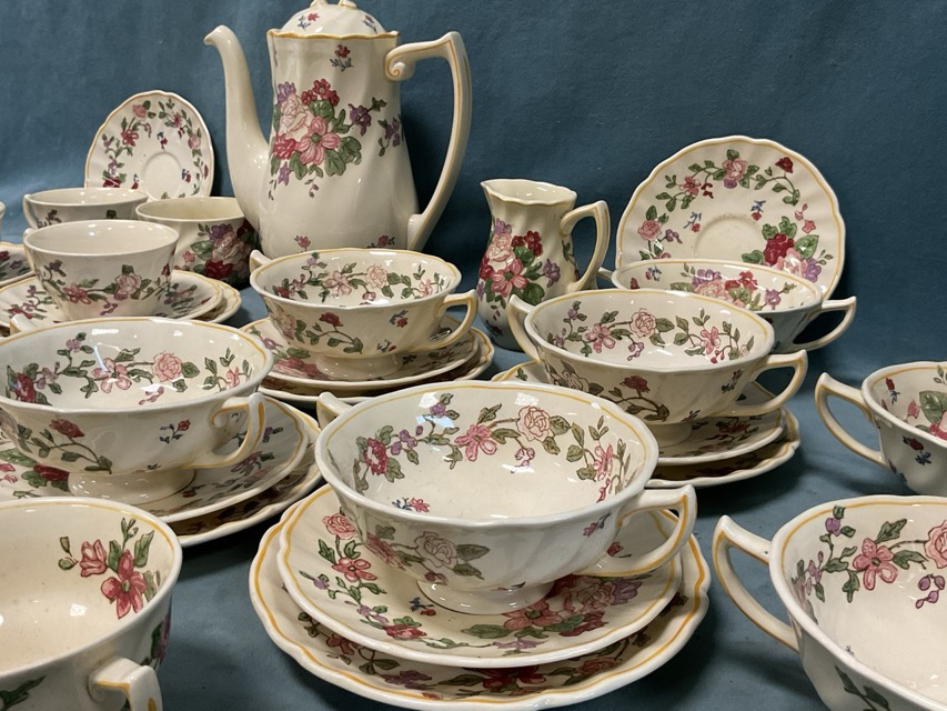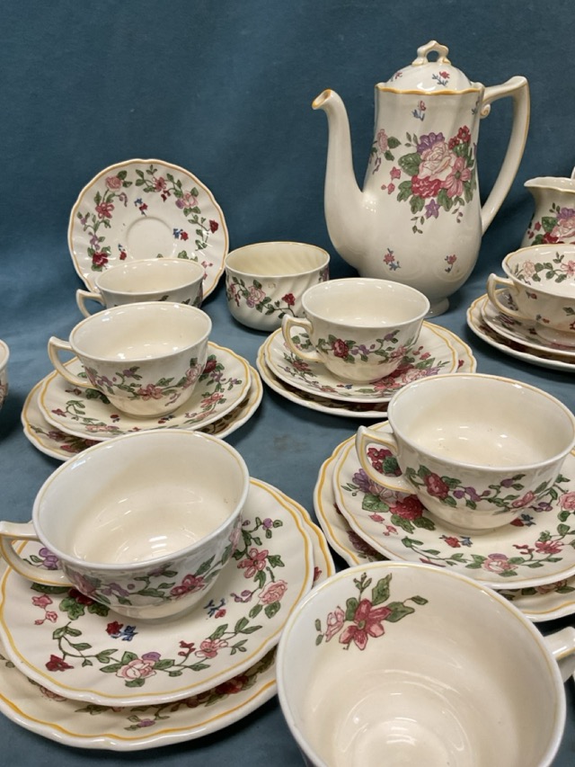 A Royal Doulton part tea service decorated in the Wildflower pattern, the ribbed scalloped pieces with floral garlands - cups, saucers, plates, teapot, handled soup bowls, etc. (A lot)