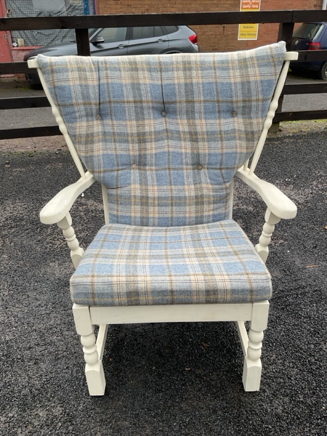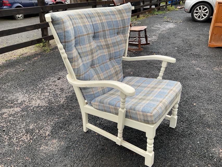 A painted spindleback armchair, the tapering back with button upholstered tweed cushion above conforming seat framed by shaped arms on turned supports.