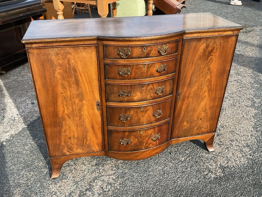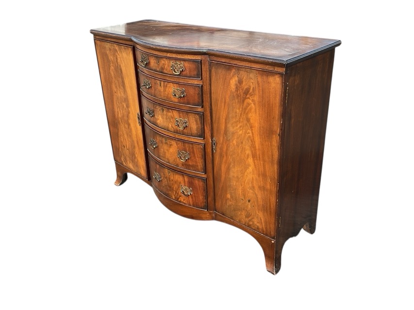 A mahogany cabinet having bowfronted central section with five cockbeaded drawers flanked by cupboards, raised on splayed feet, the moulded top crossbanded. (42in x 16.25in x 33.25in)