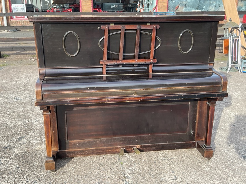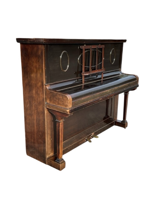 A stained Edwardian piano - The Claremont by Murdoch, Murdoch & Co of London, the instrument with seven octave keyboard in panelled case supported on square tapering columns. (56in x 22in x 45.5in)